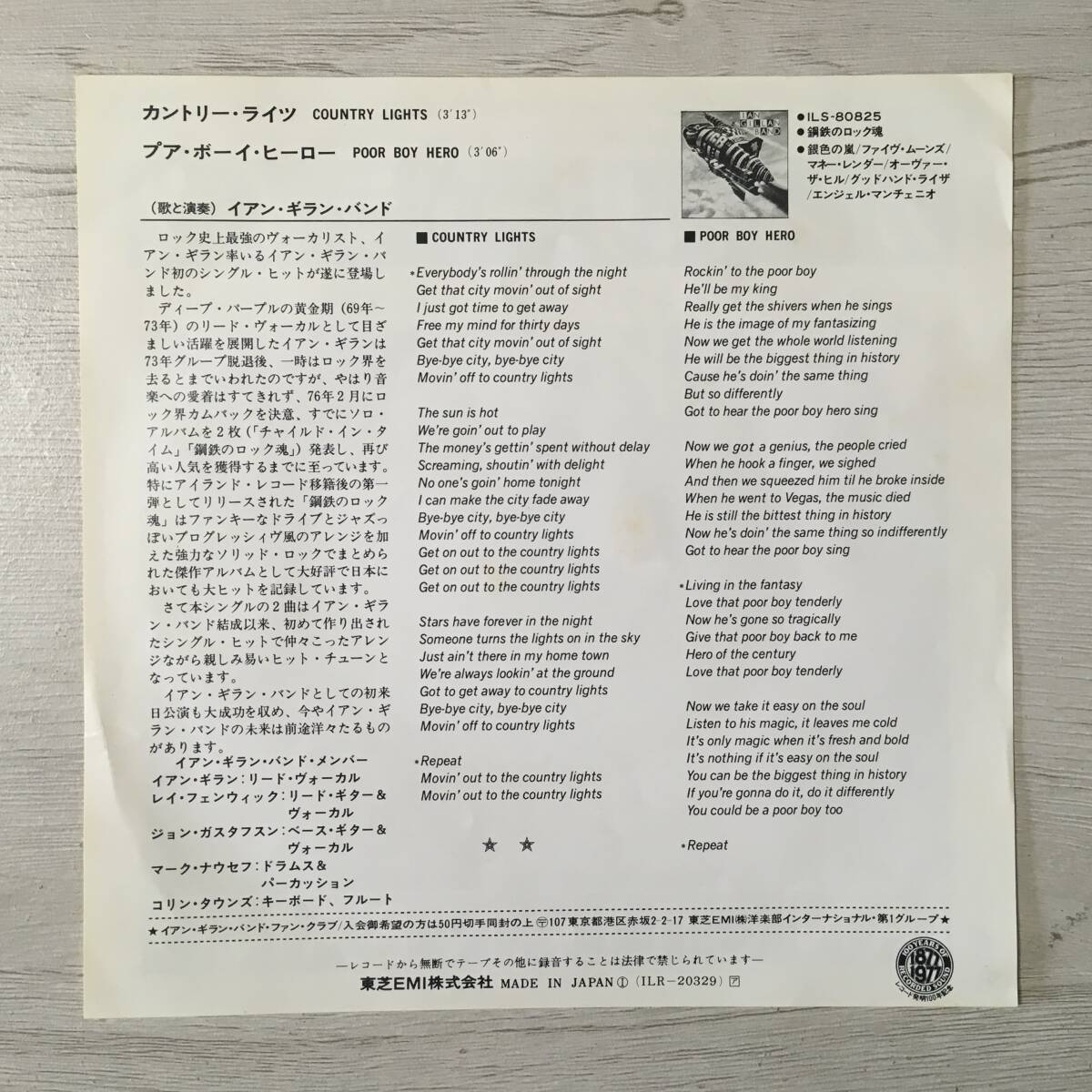 - This is a collectible vinyl record of "Country Lights" by Ian Gillan Band. It is a vintage edition suitable for music enthusiasts and collectors who appreciate classic rock and progressive jazz fusion from the late 1970s.